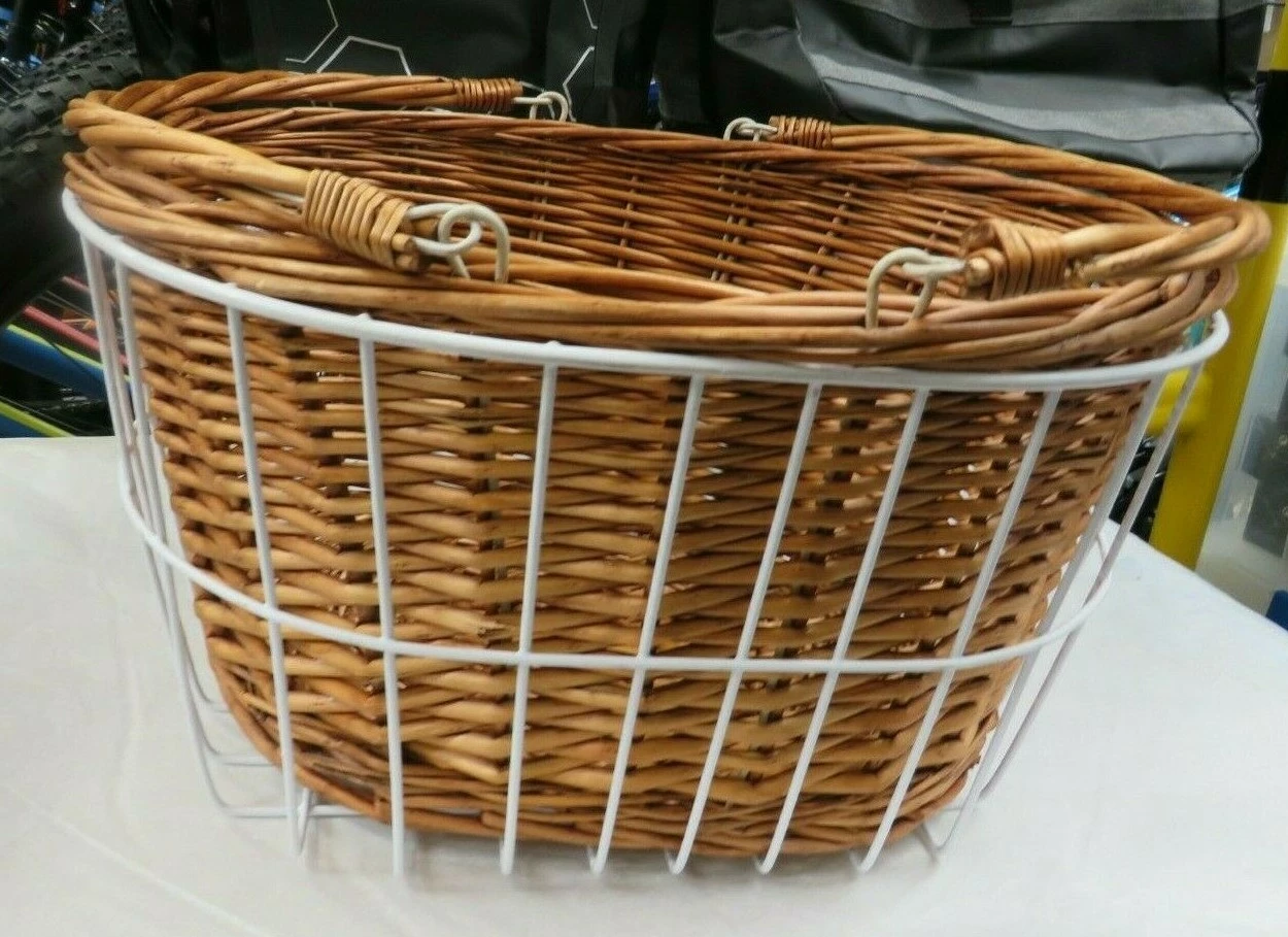 BICYCLE WICKER BASKET WITH WHITE CAGE NEW DOES NOT COME WITH FITTING KIT, BASKET cage and wicker basket – Basket has no tags -Weight: 890g ROUGHLY- – Height: 22cm – Length: 35cm – Width: 30cm – Colour: Beige