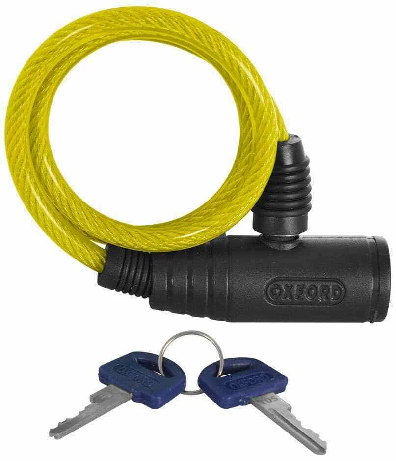 Bike Cable Lock Bumper Security Safety Bicycle Oxford 2x Keys Yellow NEW 6mm X 600mm The Bumper is a high tensile steel self-coiling cable lock. It has a simple push-to-lock mechanism. Also perfect for securing helmets and accessories. Key Features • Simple push-to-lock mechanism • Perfect for securing helmets and accessories • Plastic coated to protect paintwork • 2 keys • 600mm long, 6mm diameter cable