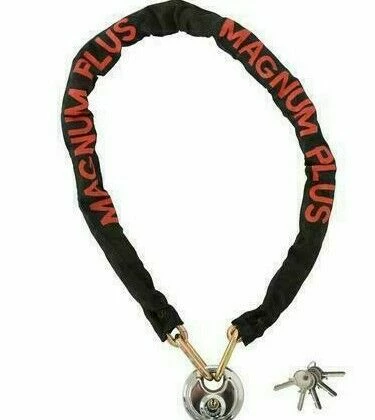 Chain Lock Heavy Duty Magnumplus Rogue 1.1 110cm x 8mm With Rotary Lock BRAND NEW COMES WITH 5 KEYS MagnumPlus Rogue Chain 1.1m x 8mm with Rotary Lock The MagnumPlus Rogue Chain 1.1m x 8mm with Rotary Lock offers motorized bike and scooter owners the highest level of security for use in high crime areas. The 8mm hardened steel square links resist damage from hacksaws and bolt cutters. Features & Benefits: Chain: Chain cover protects paint and finishes, embroidered logo won’t flake or wear off Lock: Rotary style lock provides smooth, one handed operation Tight shackle-to-body clearance eliminates pry points and makes cutting difficult 5 heavy-duty flat keys Shackle diameter: 10mm with hardened steel pin Extras: Embroidered chain cover Security rating: 6/10