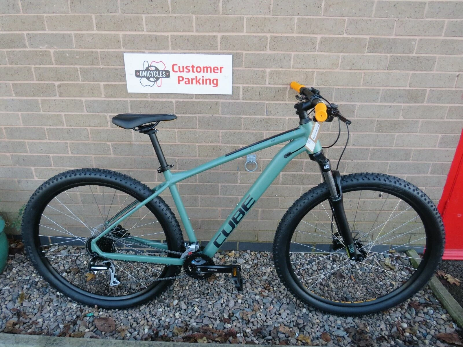 CUBE AIM PRO 29 MOUNTAIN BIKE GREEN ALUMINIUM FRAME SUNTOUR FRONT SUSPENSION 16 SPEED SHIMANO ACERA GEARS SHIMANO RAPID FIRE THUMB SHIFTERS CLARKS HYDRAULIC DISC BRAKES 29 INCH ALLOY RIMS 20 INCH ADULTS FRAME TYRE CONDITION … NEW THIS BIKE EX SHOP DISPLAY NEVER RIDDEN.