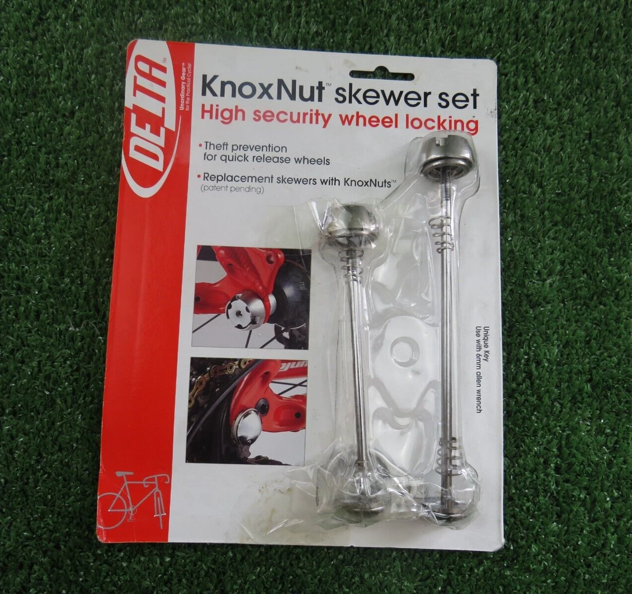 DELTA KnoxNut Skewer Set High-Security Wheel Locking Colour: Silver Features: – Theft prevention for quick release wheels – Replacement skewers with KnoxNuts