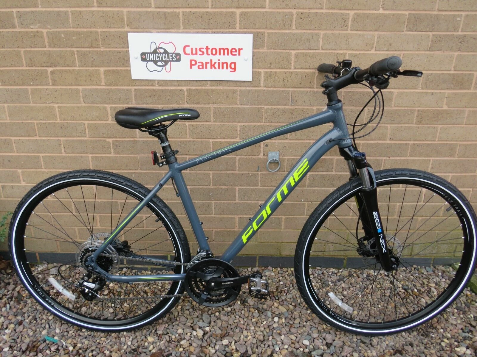 FORME PEAK TRAIL 1 HYBRID BIKE ALUMINIUM FRAME SUNTOUR FRONT SUSPENSION WITH LOCK OUT TEKTRO HYDRAULIC DISC BRAKES 24 SPEED SHIMANO ALTUS GEARS SHIMANO ALTUS RAPID FIRE THUMB SHIFTERS 700C RIMS 20 INCH ADULTS FRAME TYRE CONDITION….NEW THIS BIKE IS NEW EX SHOP DISPLAY NEVER RIDDEN.