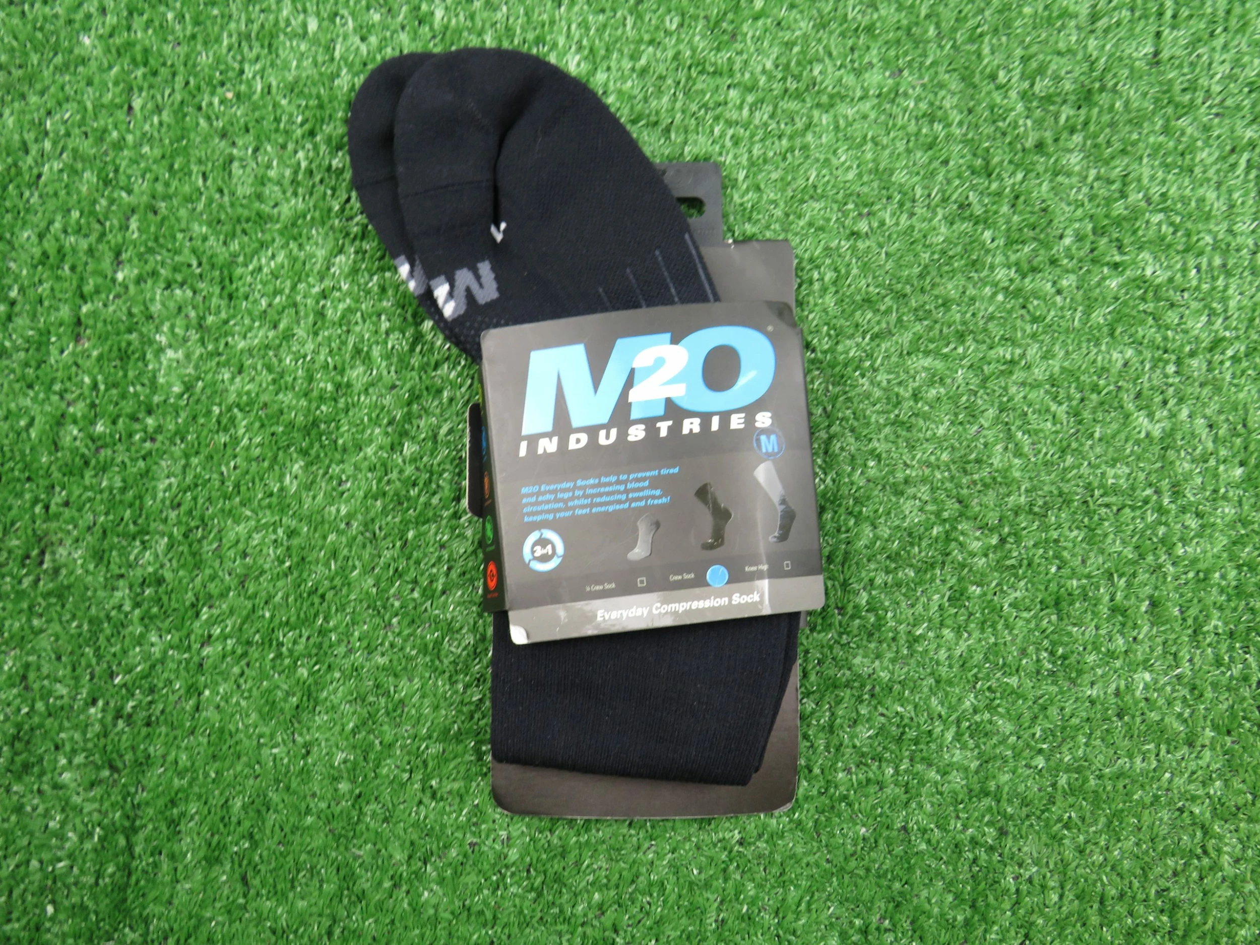 EX-DISPLAY ONE BIKE SHOW M2O Everyday Crew Compression Socks Ref: W M2O have engineered the M2O Everyday socks with a Class 1 graduated compression rating (15-20 mmHg). This everyday sock delivers the many benefits of compression, adding value to your daily health and well-being They have increased the cushioning area in the footbed to ensure the ultimate in comfort, while still applying support to your foot and ankle area with the M2O signature features in the performance and recovery ranges. You will find these socks simple and easy to put on. M2O’s Compression system is form fitting and provides graduated compression to your foot and calf. It supports the foots function its full range of motion while maintaing maximum comfort Odour reducing materials provide antibacterial protection and moisture wicking for dry feet and maximum comfort. Bolstered padding in the heel for reducing stresses on impact