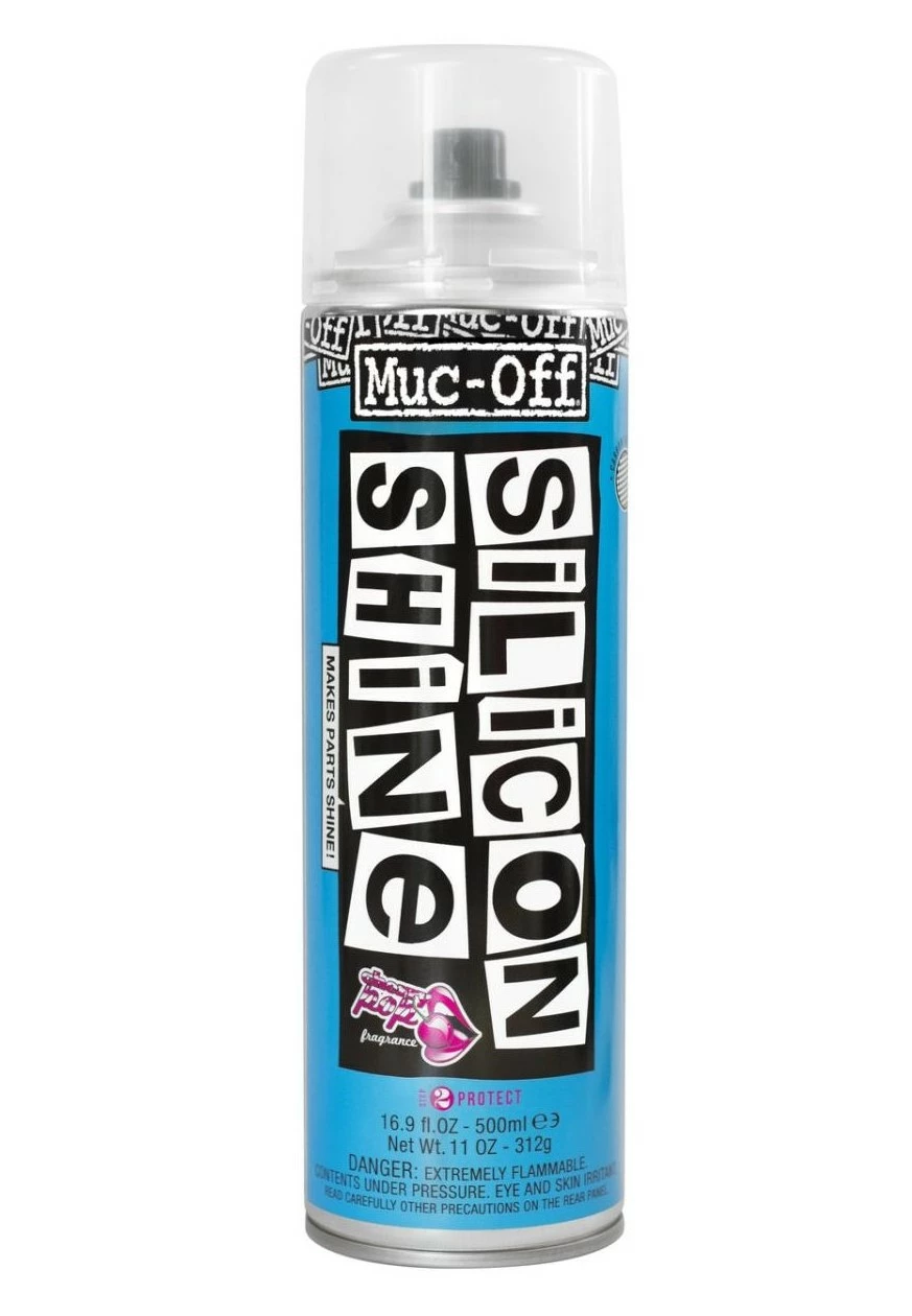 Muc Off – Silicon Shine Size: 500ml Silicon Shine not only leaves your bike looking factory fresh, but it also acts as an amazing friction reducer for suspension parts and reduces dirt adhesion. Spray it onto your fork stanchions and rear shocks to reduce resistance for a silky smooth, World Cup performance.